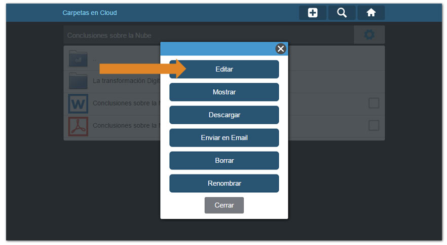 Si la edición de archivos de Office está habilitada en nuestra cuenta Dataprius, al hacer click en un archivo de Word la edición aparece en el menú de opciones del archivo.